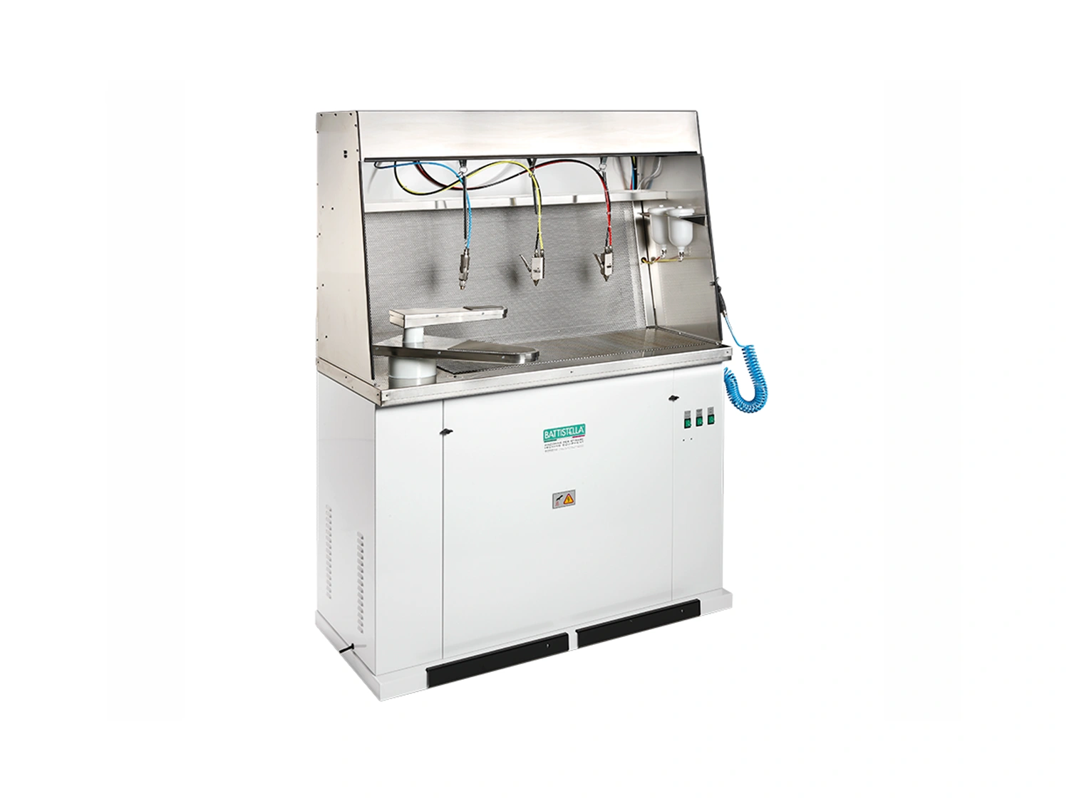 Видалення відпрацьованих розчинів та їх пар відбувається за допомогою вакуумного відсмоктування. Робоча поверхня кабіни має перфорацію, яка дозволяє витяжці втягувати пари розчинника та залишки бруду. Така система запобігає поширенню забруднень по тканині, запобігає появі розводів.